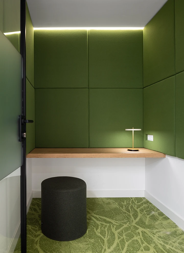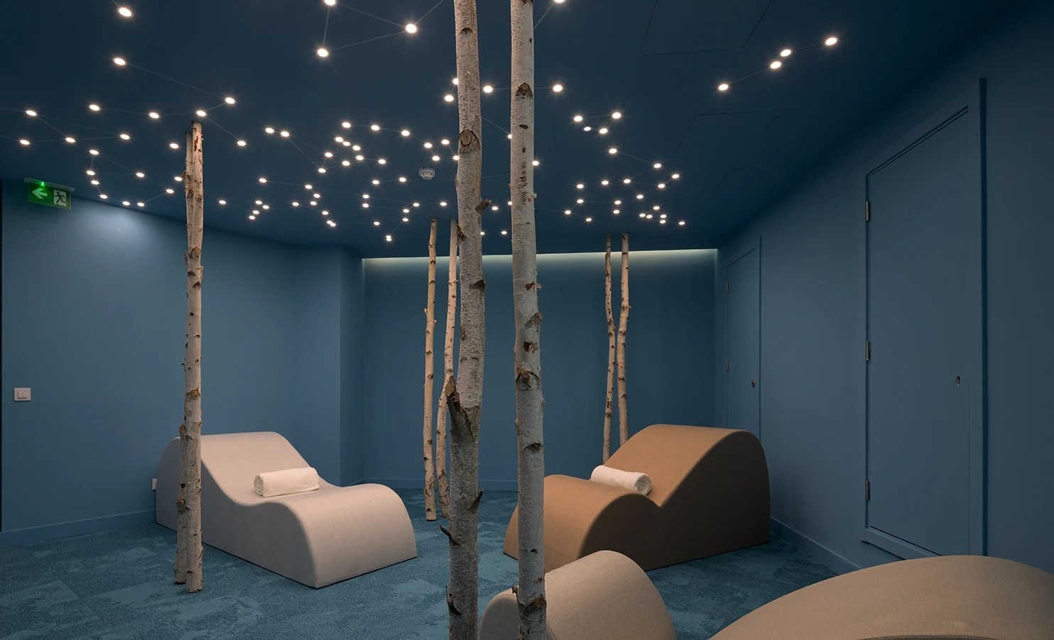 Bei diesem Projekt ging es darum, eine Umgebung zu schaffen, in der das Wohlbefinden der Mitarbeiter einer der wichtigsten Faktoren ist. Zu diesem Zweck wurde das gesamte Projekt auf einen Bar- und Loungebereich ausgerichtet, ein Treffpunkt für das gesamte Team, um Kontakte zu knüpfen und zu entspannen. Außerdem wurde ein Schlafraum eingerichtet, in dem die Mitarbeiter im Laufe des Tages kurze Pausen einlegen können, um sich zu erholen. Dieser Raum wurde bewusst blau gestrichen, bietet den Mitarbeitern die Möglichkeit, ein Gerät anzuschließen, um die Musik ihrer Wahl zu hören, und ist mit Konstellationen aus Lichtpunkten dekoriert. Bei diesem dekorativen Detail sticht das Sternbild Aquila natürlich am meisten hervor.