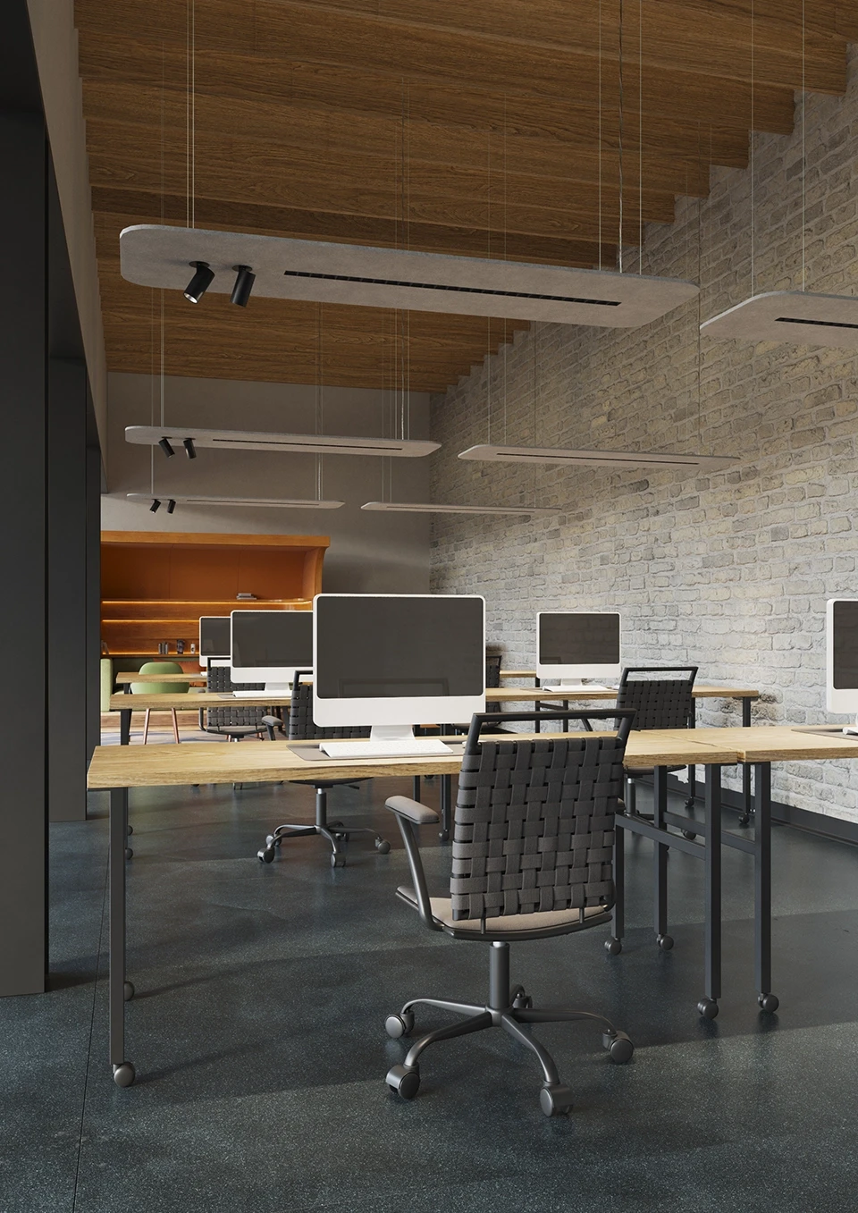 Designed to optimise sound absorption, it enhances the clarity of nearby conversations while reducing external noise, creating a calmer and more productive environment. Reduces up to 70% of reverberation. ISO 11654:1997: αw = 0.25 ISO 354:2003
