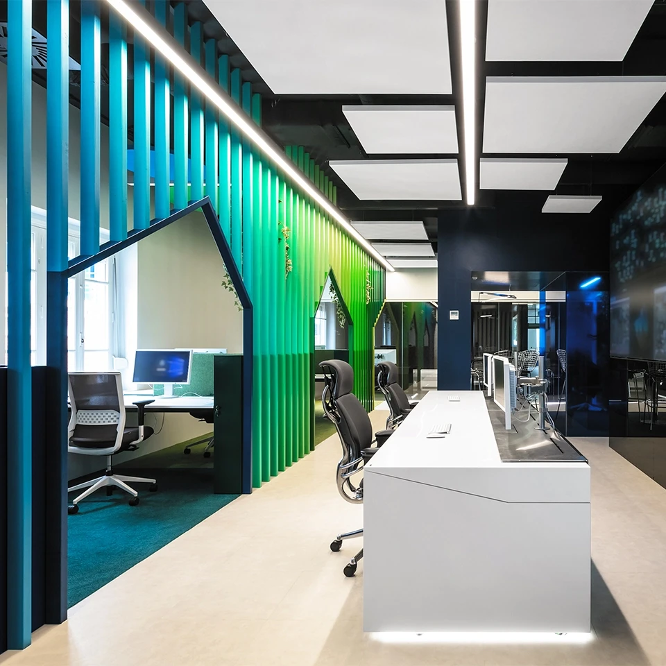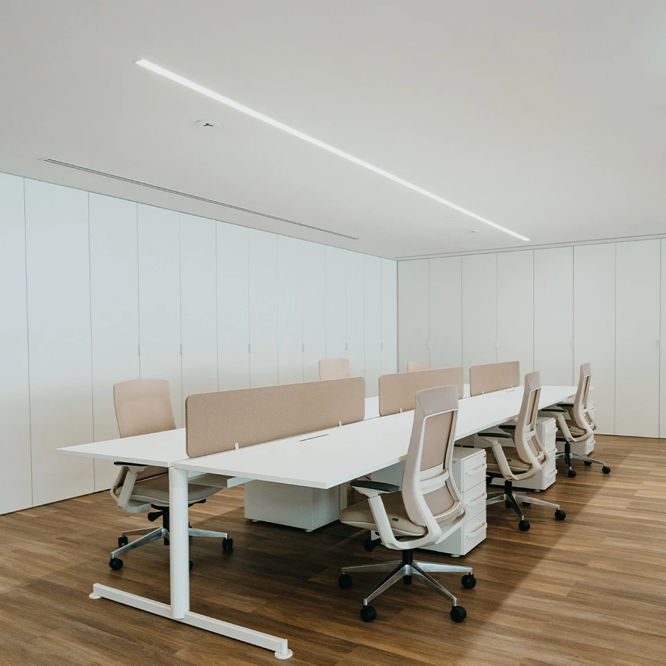Reflector interno en perfil de alto rendimiento, acabado en epoxipoliéster de color blanco para garantizar una luz de alta eficiencia, suave y uniforme. Disponible en versión simétrica o asimétrica (wall wash) con distribución luminosa directa o directa/indirecta. También disponible versión de pared que permite una distribución de luz directa, indirecta o directa / indirecta.